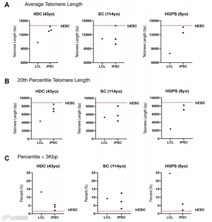 ✎ 图1.重新编程后的超级百岁老人IPSC中端粒完全重置,端粒长度接近于胚胎干细胞(HESC)的长度。