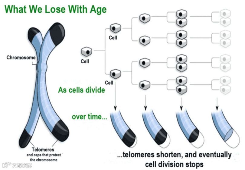 构成端粒的一部分基因约50~200个核苷酸,会因多次细胞分裂而不能达到完全复制(丢失),以至细胞终止其功能不再分裂。因此,严重缩短的端粒是细胞老化的信号。