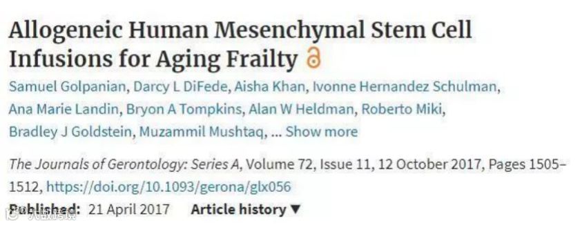 在2017年美国的Longeveron公司在Journals of Gerontology期刊上发表了一项临床研究报告就已经证实:回输年轻的间充质干细胞后,使老年衰弱综合症患者许多症状得到了改善。