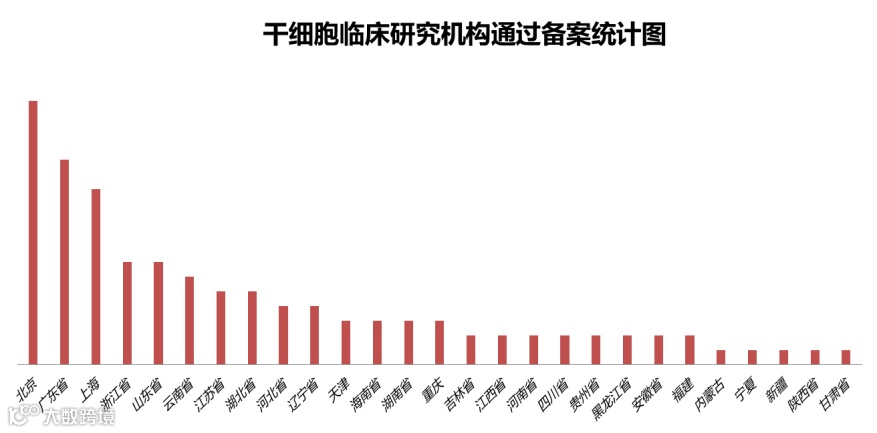 截止到目前,全国已有115家(包括军队医院)研究机构通过了干细胞临床研究机构的备案,其中北京、广东、上海已通过备案研究机构的数量仍然处于领先地位,浙江、山东、云南、江苏和湖北紧随其后。