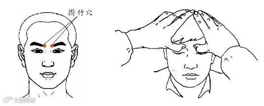 以拇指的罗纹面分别按揉左右眼部攒竹穴200次,用力均匀柔和,以酸胀为度。