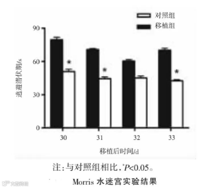 在人脐带源间充质干细胞移植第30天起进行Morris水迷宫实验,连续实验4d,结果显示,移植组的逃避潜伏期分别为(50.8±7.38)(44.47±5.88)(45.1±6.07)(42.5±3.86)s,对照组的逃避潜伏期分别为(79.5±8.15)(70.7±3.66)(60.3±4.66)(70.1±6.55)s,在相同时间点两组进行比较,移植组逃避潜伏期比对照组均明显缩短。