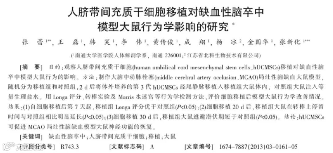 实验将人脐带源间充质干细胞移植入MCAO模型大鼠体内,观察到自移植后第七天起,移植组比对照组大鼠神经功能恢复显著。