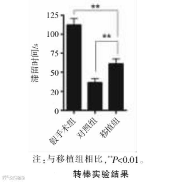 在人脐带源间充质干细胞移植后第30天进行转棒实验,结果显示移植组大鼠在棒上的停留时间为(61.08±22.55)s,对照组为(36.33±18.82)s。两组相比,移植组停留时间明显延长,差异具有统计学意义,说明细胞移植后动物的运动功能改善明显。
