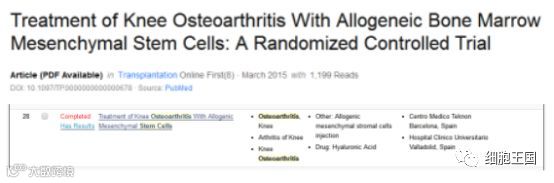 2015年10月西班牙巴利亚多利德大学医学院,完成了一项名为同种异体间充质干细胞治疗膝关节骨性关节炎后的随机对照试验,该试验共招募30参与者,并随机分配成试验组与对照组两组。试验组患者将进行同种异体间充质干细胞的关节内移植,细胞来自健康供体的骨髓,制注射细胞量为4000万。而在对照组中,给予关节内注射透明质酸(60毫克)的标准治疗。
