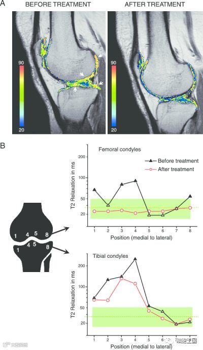 磁共振结果显示,膝关节软骨体积较治疗前均有显著增加,软骨下骨髓水肿亦较治疗前有显著改善。