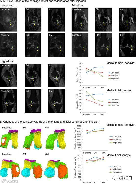 (B) :高剂量组注射脂肪间充质干细胞(AD MSC)后6个月内股骨内侧髁(上排绿色;右膝从上部观察)和胫骨内侧髁(下排橙色;右膝从下部观察)关节软骨体积的变化。高剂量组股骨内侧(右上图)和胫骨髁部(右下图)关节软骨体积显著增加。