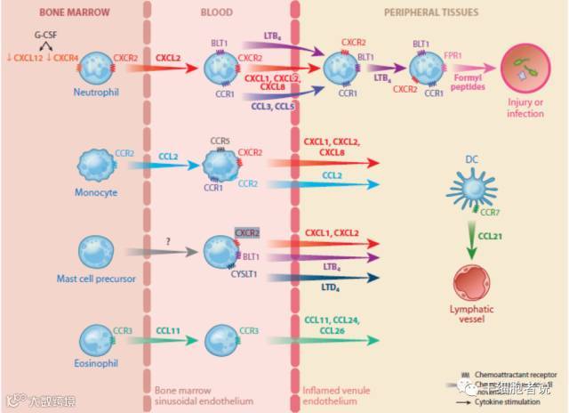 图注:炎症过程中骨髓,血液和周边组织之间的趋化因子交流。[4]