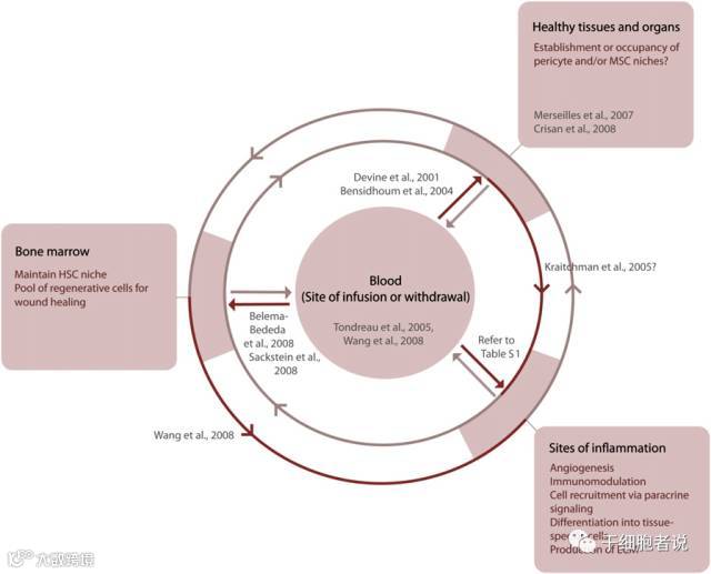 图注:间充质干细胞在不同的解剖位置发挥着不同的功能。炎症反应包含创伤、慢性炎症反应(如移植物抗宿主病)和肿瘤等。[2]