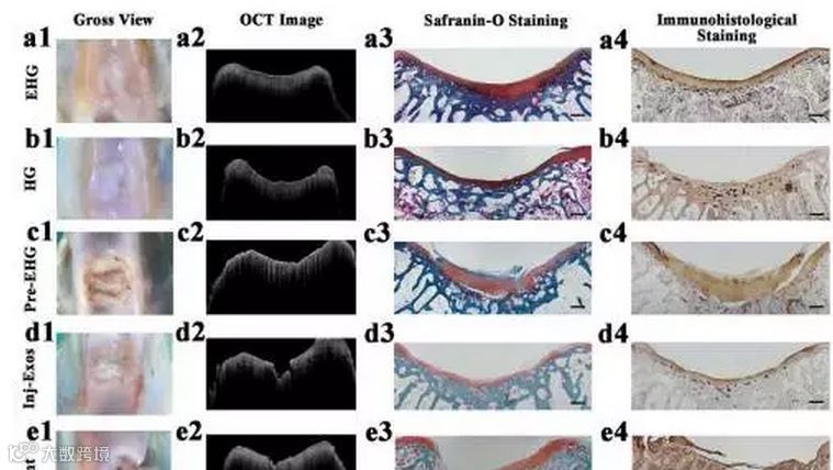 据悉,光诱导亚胺交联水凝胶胶呈现出优良的操作能力、生物相容性和最重要的软骨整合能力,可作为外泌体支架用作软骨再生的无细胞组织补丁(EHG),研究发现 EHG 可以将外泌体保留在内部并在体外调节软骨细胞和hBMSCs。此外,EHG 还可以与自身软骨基质整合,促进细胞沉积在软骨缺损部位,最终促进软骨缺损的修复,研究人员表示,希望 EHG 组织补丁能提供一种新的无细胞支架材料用于帮助伤口修复。