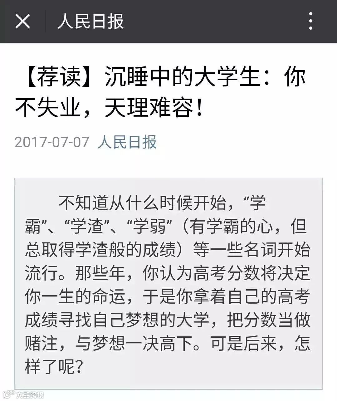 不知道从什么时候开始,“学霸”、“学渣”、“学弱”(有学霸的心,但总取得学渣般的成绩)等一些名词开始流行。那些年,你认为高考分数将决定你一生的命运,于是你拿着自己的高考成绩寻找自己梦想的大学,把分数当做赌注,与梦想一决高下。可是后来,怎样了呢?
