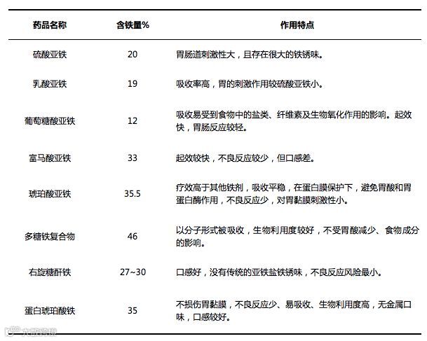 口服铁剂品种众多,临床常用的口服铁剂为以下八种,每种含铁量和作用特点均不同,如下: