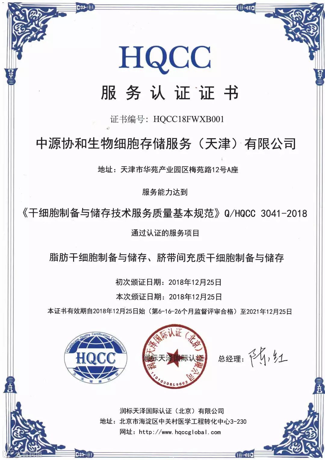 HQCC(润标天泽国际认证有限公司)是由国家认证认可监督管理委员会批准的认证机构,专业从事卫生保健和社会福利领域服务认证工作,也是目前唯一一家在干细胞领域开展服务认证的机构。本次认证的依据是《干细胞制备与储存技术服务质量基本规范》,该标准规定了人源干细胞制备与储存机构技术服务的基本要求、服务项目与质量要求、服务评价与改进,适用于人源干细胞制备与储存机构的规范技术服务。中国第一张HQCC干细胞存储与制备服务认证证书的诞生标志着干细胞企业的服务更加规范化。干细胞存储与制备服务认证是目前干细胞机构服务的唯一评价标准,服务认证是为干细胞存储与制备的行业服务提升保驾护航,更是企业标准化建设的“有效答卷”。