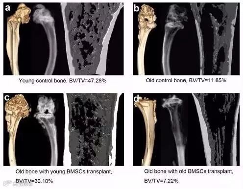 将1-2月龄的年轻小鼠和20-24月龄自然衰老老年小鼠的BMMSC移植至自然衰老的雌性小鼠中, 6个月后发现移植年轻小鼠MSCs组骨膜有更多的MSCs, 且骨钙素 (OC) 含量要远高于老年组, 这也证实了老化后MSCs的增殖、归巢及成骨分化能力均要减弱, 另外同时发现移植至年轻小鼠MSCs组的小鼠平均寿命长于老年组。