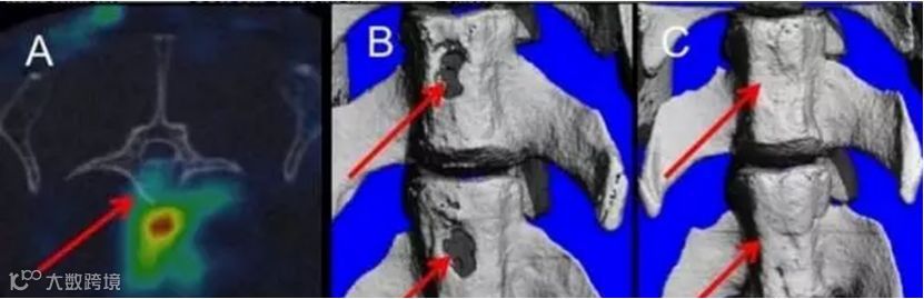 图1 A 干细胞靶点的脊柱骨折;B 两个脊椎骨折;C 干细胞与甲状旁腺素治疗 8 周后修复的脊柱