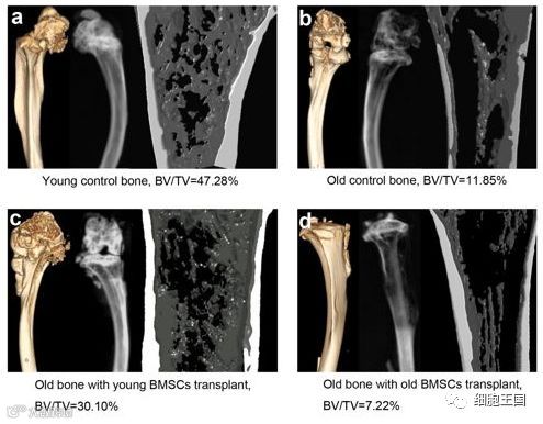 将1~2月龄的年轻小鼠和20~24月龄自然衰老老年小鼠的BMMSC移植至自然衰老的雌性小鼠中, 6个月后发现移植年轻小鼠MSCs组骨膜有更多的MSCs, 且骨钙素 (OC) 含量要远高于老年组, 这也证实了老化后MSCs的增殖、归巢及成骨分化能力均要减弱, 另外同时发现移植至年轻小鼠MSCs组的小鼠平均寿命长于老年组。