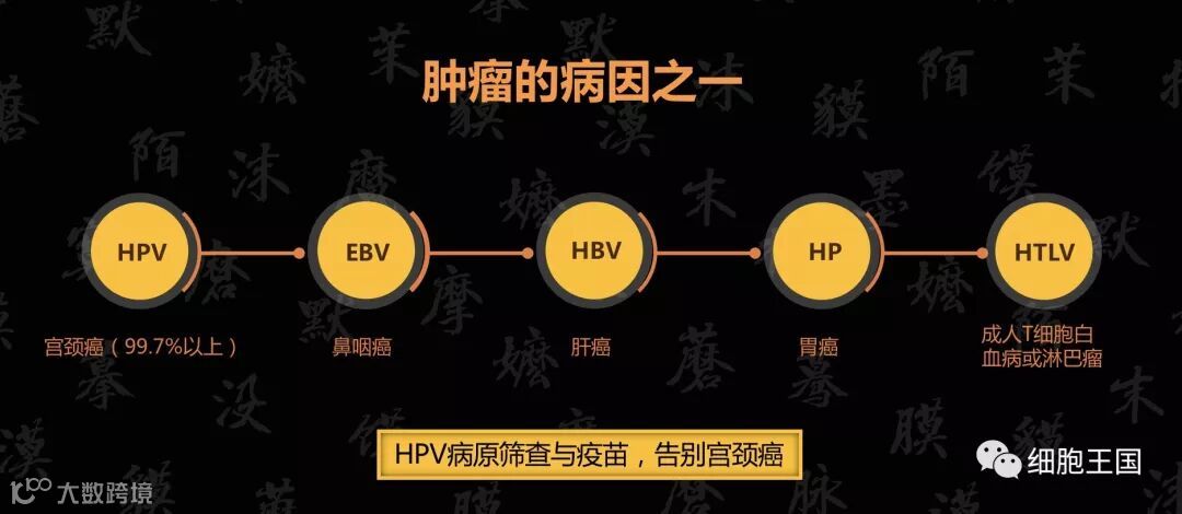 那么,后天发生的肿瘤除了肺癌之外,还有什么在中国高发的?消化道肿瘤。包括食道癌、胃癌、结直肠癌。消化道肿瘤是怎么产生的?大部分都是食品安全、饮食习惯所导致的。例如山西有个村庄喜欢喝烫酒,长年累月的习惯导致食道受到很大的、反复的伤害,从而导致食道癌。胃癌,也是由于类似的原因。此外,还有由外来入侵病毒感染导致的癌症,包括HPV,EBV,HBV,HTLV,HP等。另外,外界刺激也会导致肿瘤的发生。比如白血病。