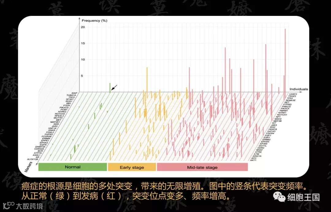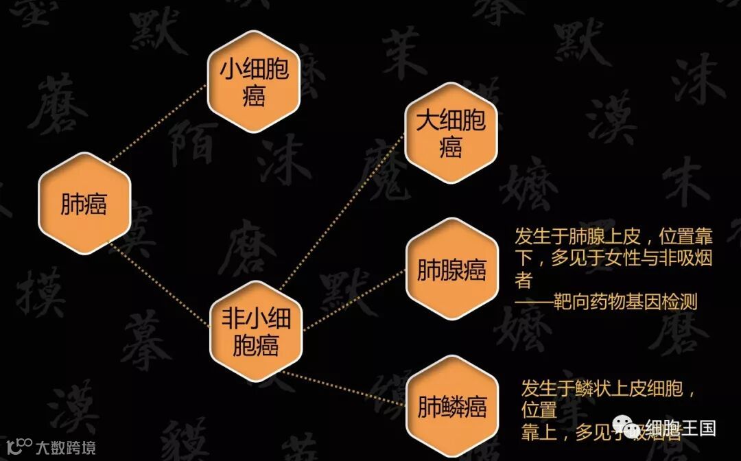 不同的肿瘤的致病机理不一样,也可以分为先天的,也就是遗传性的;还有后天的,因为环境等作用导致发生突变或感染的。肺癌是典型的由于环境刺激导致的,现在所有的证据都没有显示肺癌和遗传相关。肺癌又可以分为“小细胞肺癌”和“非小细胞肺癌”, “非小细胞肺癌”又可以分为大细胞肺癌,腺癌,鳞癌。那么从基因的角度去看,能做什么?小细胞癌,基本没有什么能做的;非小细胞癌里的鳞癌,也是基本没有手段;在中国发病率较高的,是非小细胞癌里的腺癌和鳞癌。腺癌我们可以简单理解为癌变“进到肉里了”,怎么进去的?举个例子,pm2.5。pm2.5的颗粒非常微小,小到可以渗透到肺的“肉里”。相比之下,鳞癌的常见致病原因是吸烟,烟的颗粒要比pm2.5大得多。(雾霾可能导致肺癌目前并没有相关研究证实,只是一种猜测。)