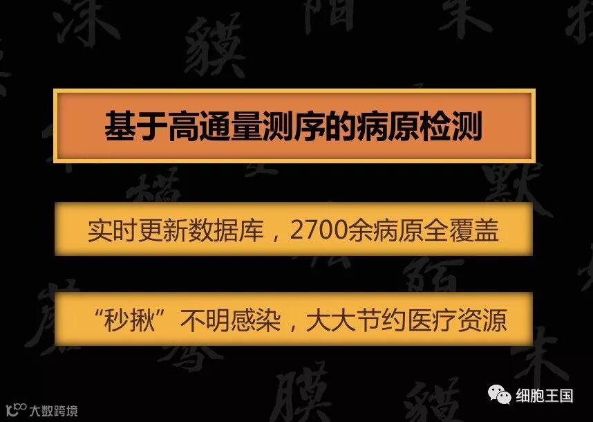 说到“生、死、染”,这个“生”最直观,就是去查宝宝的出生缺陷。在这个领域,很多人觉得现在NIFTY能查的,仅仅是新生儿的唐氏综合征等染色体异常疾病;其实,结合百万大数据,现在已经能够检测到怀孕妈妈的孕期肿瘤了。肿瘤就对应着“死”,而细菌、病毒则对应着感染,也就是“染”。 “生、死、染”指的就是这个。