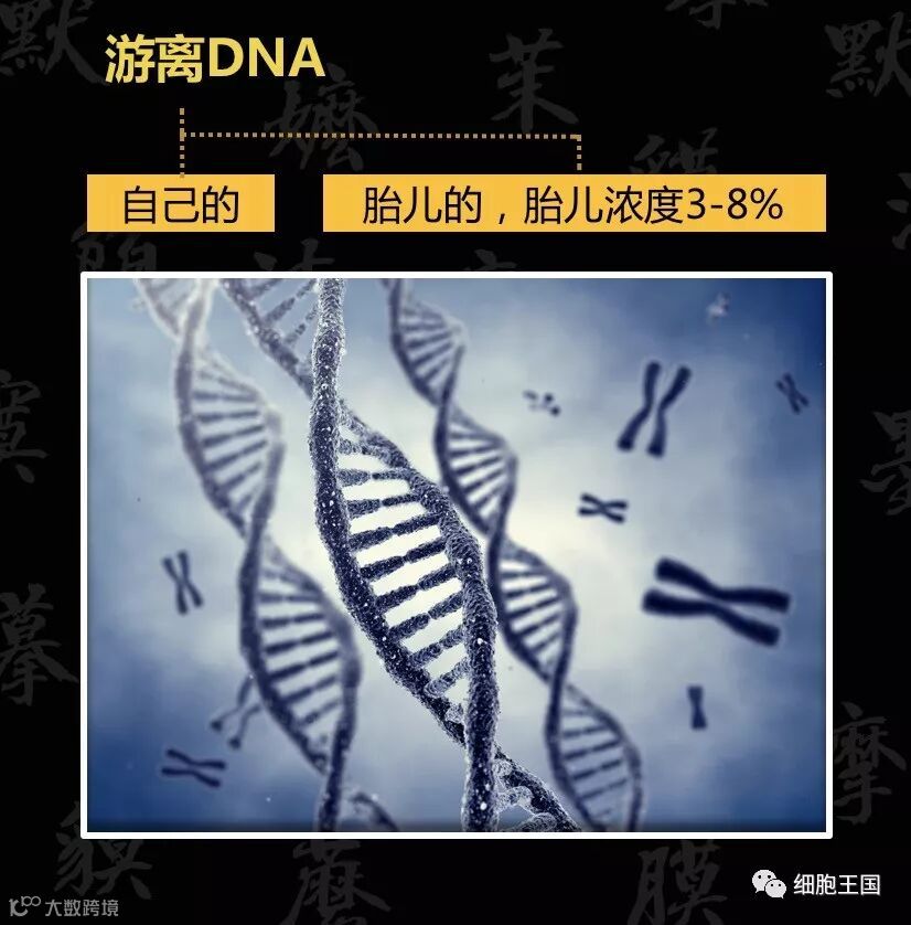 也有可能是宝宝通过脐带和母体血液交换带来的游离DNA——做无创产前基因检测NIFTY,测的就是这个,而不是刚才说的有细胞核的红细胞。这里有个专门的指标,叫“胎儿浓度”。简单理解,指的是宝宝的游离DNA在妈妈DNA里的比重,这个浓度在3%-8%之间。