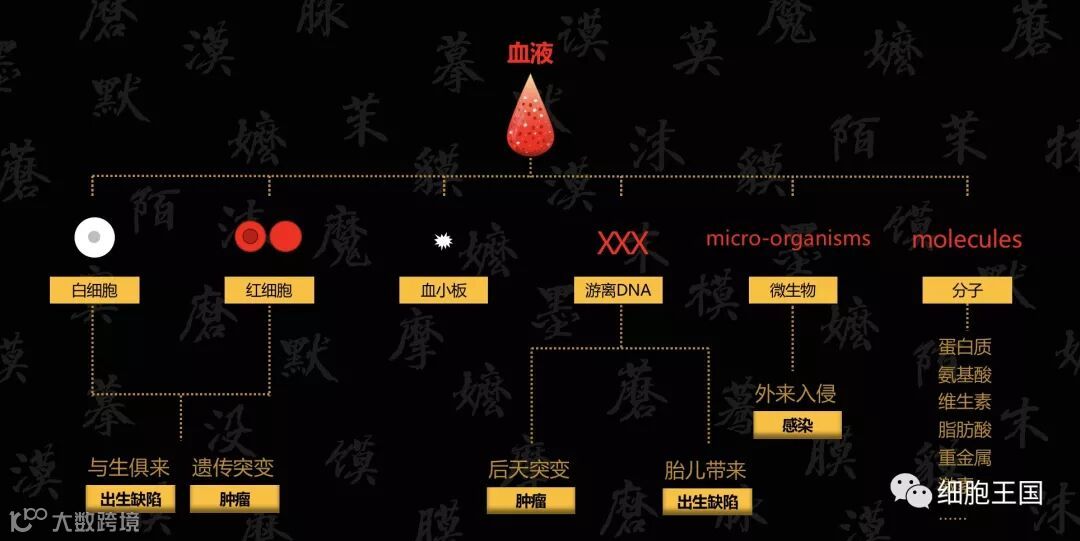 此外,动植物的DNA也会以游离DNA的形式出现在人的血液内;还有外来入侵的细菌、病毒等的遗传物质也会在我们这滴血里体现出来。另外,蛋白质protein、小分子small molecule也是蕴含在一滴血中的重要信息。蛋白质分解出来变成氨基酸,其它的小分子还包括维生素、脂肪酸、激素、重金属等。