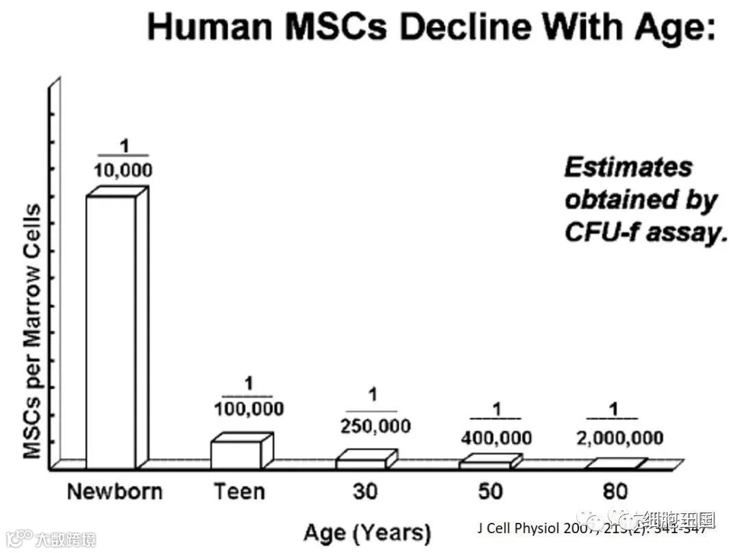 年龄越大,在骨髓中的干细胞就越少:刚出生时,骨髓1万个单个核细胞中就有1个是MSC;30岁时,MSC的数量减少到骨髓25万个单个核细胞中才有1个MSC;到80岁时,MSC的数量就更少了,骨髓200万个单个核细胞才有1个MSC。