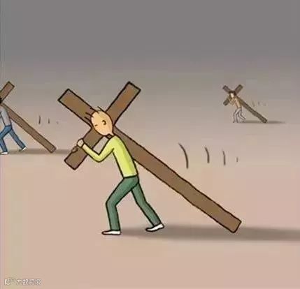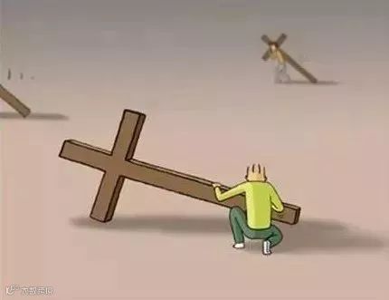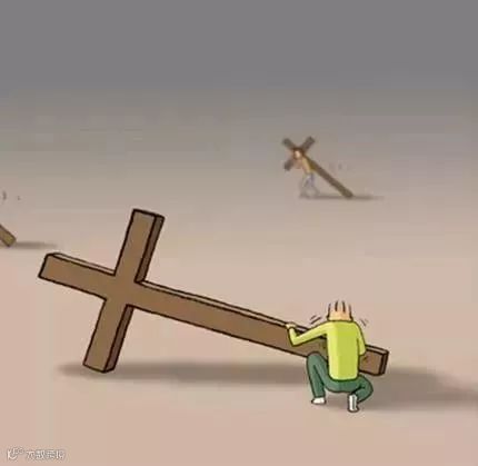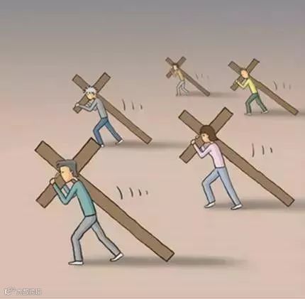 第一幅漫画中,每个人都背负着一个沉重的十字架,在缓慢而艰难地前行!