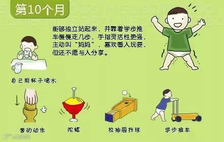第10个月:能够站起来、偶尔可以走几步、可以自己用杯子喝水、喜欢看人玩耍、还不愿与人分享。