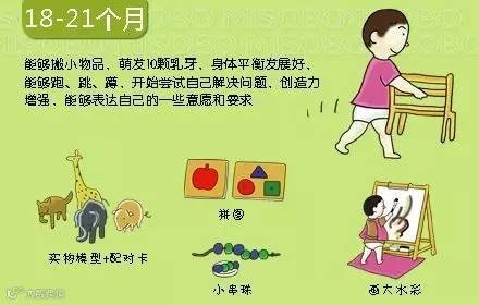 第18-21个月:能够搬动小物品、萌发10颗乳牙、身体平衡力发展良好、能够跑跳蹲、开始尝试自己解决问题、能够表达自己一些意愿和要求、创造力增强。