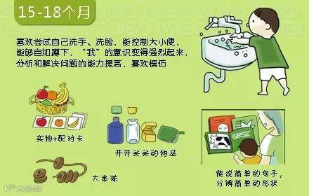 第15-18个月:喜欢尝试自己洗手、洗脸、能控制大小便、能够自如蹲下,能说简单的句子、分析和解决问题的能力提高、喜欢模仿。