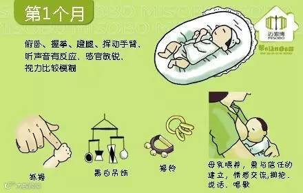 第1个月:俯卧、握拳、蹬腿、挥动手臂、听声音有反应、感官敏锐、视力比较模糊。