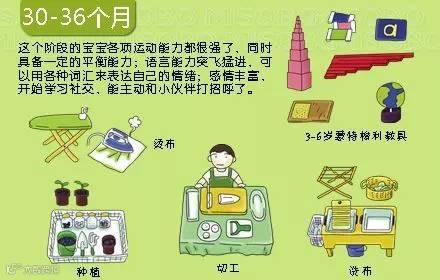 第30-36个月:可以独立做切、洗、种植等工作,可以用各种词汇来表达自己的情绪,开始学习社交,主动和小伙伴们打招呼了,语言能力突飞猛进,各项运动能力已经很强了。