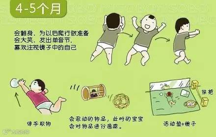 第4-5个月:会翻身,会大笑,发出单音节,喜欢注视镜子中的自己。