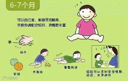 第6-7个月:可以自己坐、能够灵活翻身、手眼协调配合较好、表情更丰富。