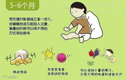第5-6个月:有支撑能够独立坐一会,会喃喃自语引起别人注意,躺着的时候可以用不同的方式滚动身体。
