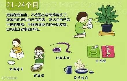 第21-24个月:走路稳稳当当、能够独立做一些事情,如洗手、上厕所等,手眼协调能力进一步加强、可以做一些简单的家务,如浇花等。