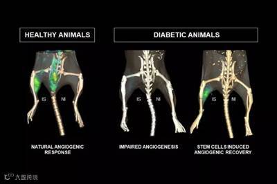 研究人员通过外科手术缩小了一腿糖尿病小鼠的股动脉。他们注射了MSCs,从幼鼠的肌肉中,注入实验小鼠的腿部,而对照组则注射了盐水。然后他们使用了非侵入性成像技术,在Dobrucki的实验室中开发,用来监测老鼠的血流和血管形成,比较实验和控制组和每只老鼠的受影响和不受影响的腿。