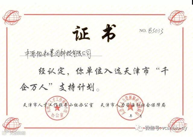 4月13日,中源协和旗下中源协和基因科技有限公司喜获天津市人力资源、社会保障局、天津市人才工作领导小组办公室联合颁发的“千企万人”荣誉证书,正式入选天津市“千企万人”支持计划平台项目。这是该公司继本年度获得“国家高新技术企业证书”,“博士后科研工作站”等荣誉之后的又一项殊荣。