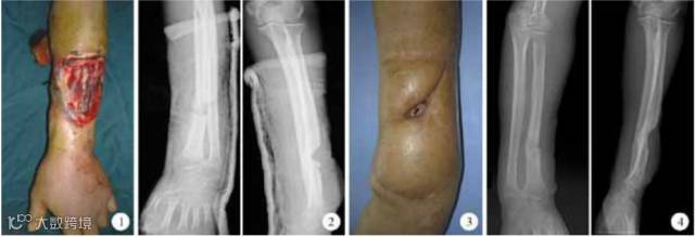 解放军第98医院烧伤整形科收治1例因机器轧烫伤致桡骨骨折、术后骨折感染外露、创面常规治疗不愈患者,采用脐带间充质干细胞局部移植治疗4次后,创面肉芽组织迅速增生、填满窦道并上皮化,12天后创面愈合。x线片检查示治疗后骨折端骨痂开始大量生长、骨折线渐模糊。伤后1年患者入院行皮瓣修薄术,见局部皮肤无溃破,骨折愈合并重塑。