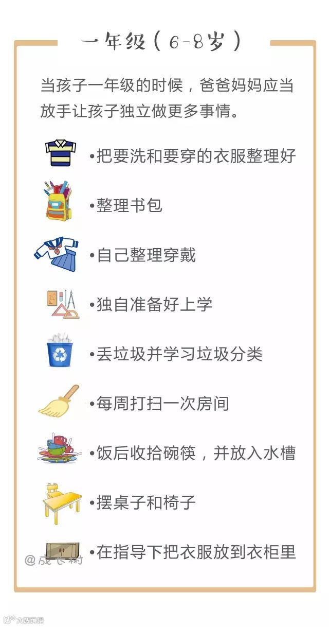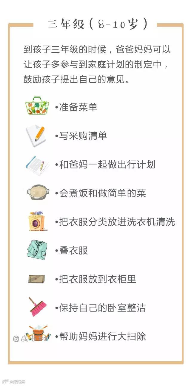 其实从孩子3岁开始,妈妈们就可以有意识地培养孩子做家务了。对照下面的家务年龄表,妈妈们可以更好地把握什么年龄的孩子该做哪些家务。