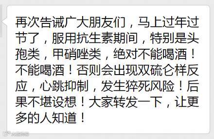 提到了酒精,估计有些宝爸宝妈们就想起了,原来就是和那个喝酒前后不能吃绝大多数的头孢类药物的原理一样,朋友圈里经常(尤其是春节前后)会看到下面类似的转发吧: