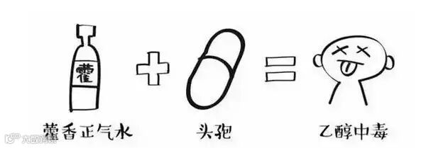 所以,上文中孩子中毒的药物原理就系这样滴:藿香正气水中含有酒精,在体内消化产生乙醛,而头孢类药物会抑制乙醛在体内的代谢,造成乙醛蓄积,引起中毒,严重时可诱发急性肝损害、呼吸暂停甚至死亡。另外,通常名字中含有“酊”字的药物都含有酒精,不可与头孢、甲硝唑等同时服用,即使停药后一两周内也要远离酒精。