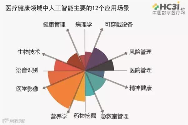 人工智能对于医疗健康领域中的应用已经非常广泛,从应用场景来看主要分成了语音识别、医学影像、药物挖掘、营养学、生物技术、急救室管理、医院管理、健康管理、精神健康、可穿戴设备、风险管理和病理学共12个领域。