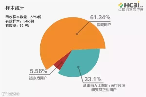样本统计:本次调查问卷回收样本数量达到5693份,有效样本5465份,有效率达95.9%。本次样本对象包含了61.34%医院用户,33.1%从事与人工智能+医疗领域相关的企业用户,以及5.56%的资本方用户。