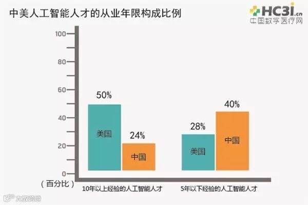 从中美人工智能人才的从业年限构成比例上看,美国拥有10年以上经验的人工智能人才比例接近50%,而我国十年以上经验的人才比率只有不到25%。然而,美国5年以下经验的人才比例约为28%,而我国的这一数字比率超过了40%。尽管我国人工智能专业人才总量较美国和欧洲发达国家来说还较少,10年以上资深人才尚缺乏。可见,在我国,人工智能领域的专业人才供求失衡严重,供求比例接近1比10。国内企业百度、腾讯、滴滴等以设立研究院的形式,杀入美国高科技中心硅谷,与谷歌、亚马逊、微软等企业掀起人才的激烈争夺战。
