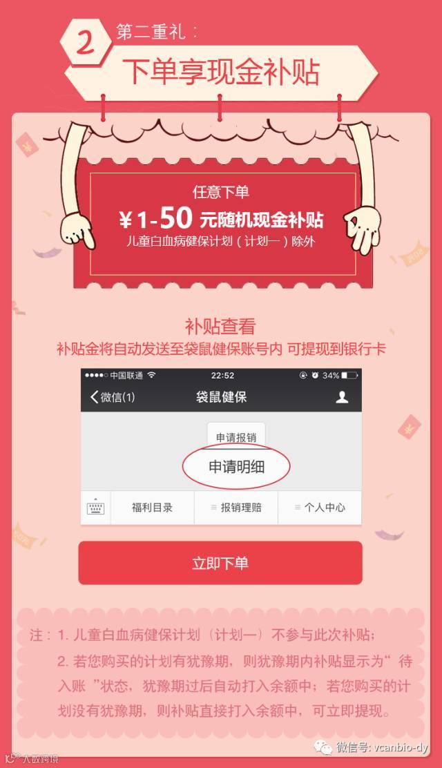 脐血储户下单购买任意健保计划,就能享受1-50元随机现金补贴(儿童白血病健保计划一除外)!此优惠可与其他优惠叠加,更实惠!