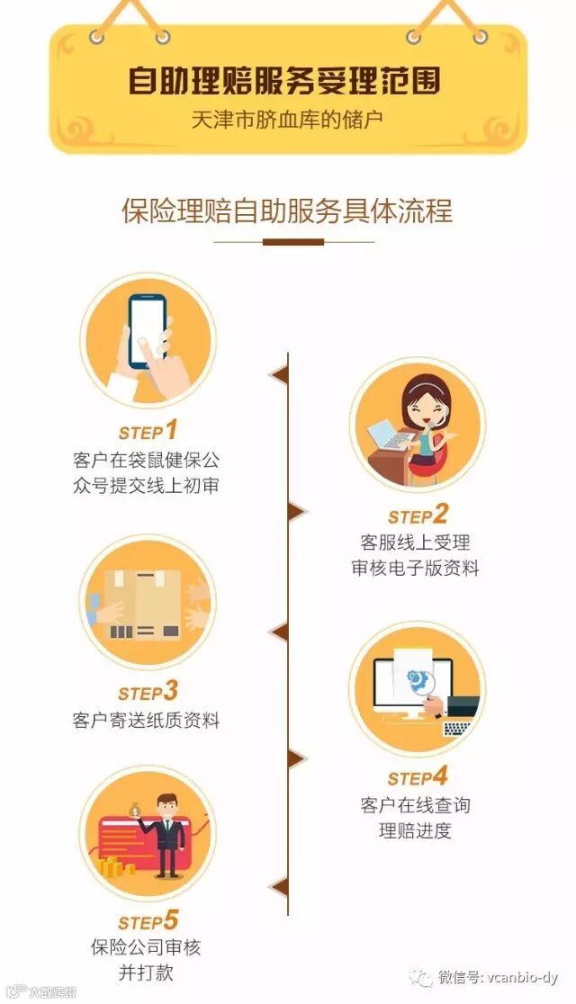 脐血储户将通过关注“袋鼠健保”微信公众号,申请理赔资料线上初审,通过后再进行资料寄送,免去了反复寄送资料的烦恼。