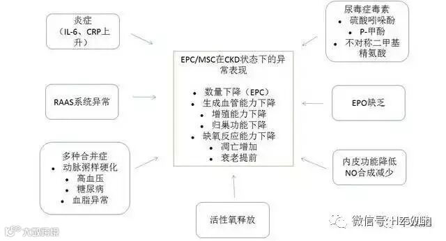 与健康人群相比,EPC 在 CKD 患者中数量明显减少,间充质干细胞数量是否减少尚没有肯定的结论。但这两种细胞的功能均有所下降。其可能的影响因素包括炎症、肾素 - 血管紧张素 - 醛固酮(RASS)系统激活、多种合并症、尿毒症毒素、促红细胞生成素(EPO)缺乏、内皮功能障碍。