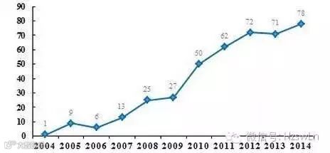除了上述已上市的间充质干细胞药物,根据Clinicaltrials.gov统计,截至2015年3月30日,全球已注册的应用间充质干细胞的临床研究数量已达454项,并且数量在2004年至2014年呈明显增长趋势,如图所示。