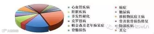 目前可应用其治疗的疾病有心肌梗死、癌症、GVHD、关节炎、脊髓损伤、淋巴瘤、白血病、贫血、糖尿病、帕金森及老年性痴呆等。具体的数量和所占比例如图。